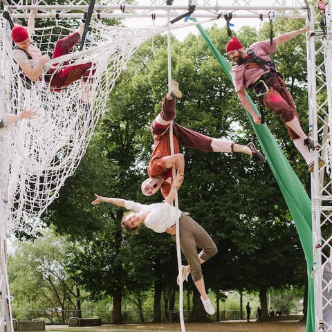 an aerial theatre company combining the silly and the serious to create performances for indoor, outdoor and digital spaces.